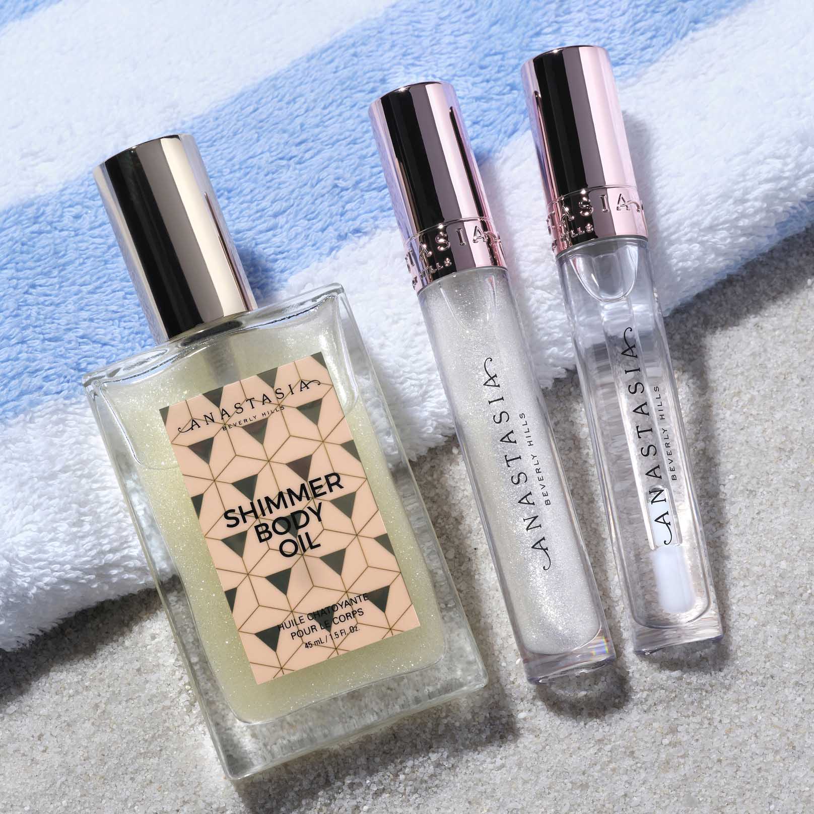 Bask in the NEW Beachside Glow Set: Shimmer Body Oil for silky, sun-kissed skin + two Lip Glosses in season-ready shades.